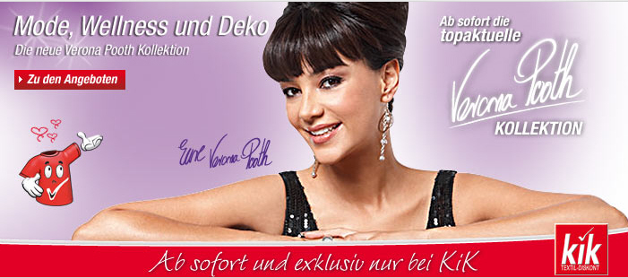 Darüber hinaus wirbt Verona Pooth seit 2009 unter dem Slogan “KiK – Besser als wie man denkt” sehr erfolgreich für den Textildiscounter. In TV-Spots und in KiK-Prospekten präsentiert Verona Pooth aktuelle Mode-Outfits des Textildiscounters. Mittlerweile gibt es sogar schon eine eigene Verona Pooth-Kollektion.